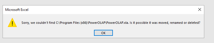 "Sorry, we couldn't find C:\Program Files (x86)\PowerOLAP\PowerOLAP.xla. Is it possible it was moved, renamed or deleted?"