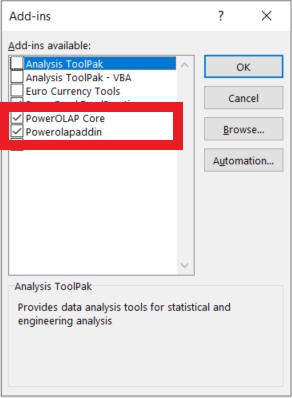 - The Excel Add-ins should only be PowerOLAPCore.xll and PowerOLAPAddin.xlam