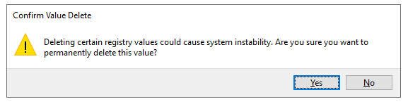 4. You will receive a pop up to confirm the deletion of the registry value as shown below: