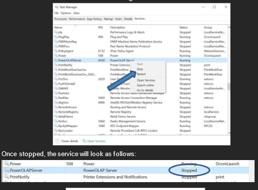 11. Return to Task Manager and click on the Services tab. Find PowerOLAP Server: